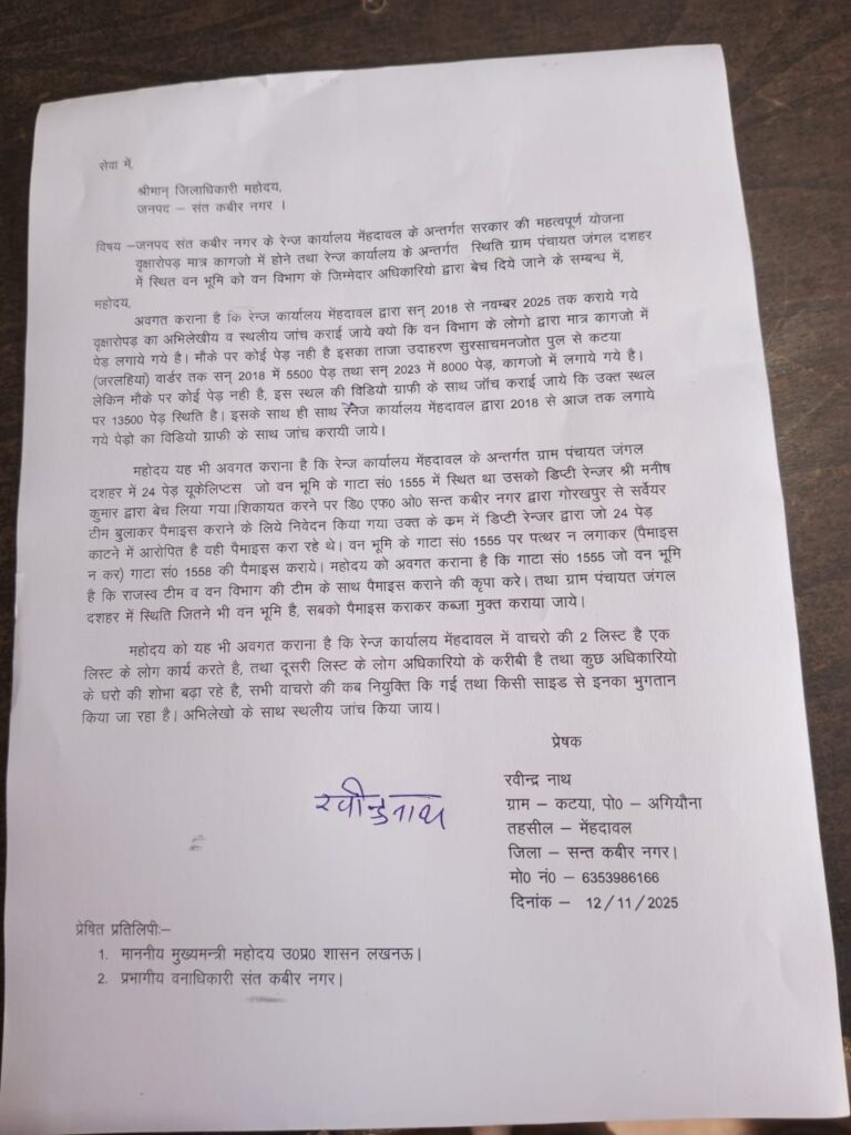 संतकबीरनगर। ग्राम कटया निवासी रवीन्द्र नाथ ने जिलाधिकारी को पत्र भेजकर मेहदावल रेंज कार्यालय पर गंभीर आरोप लगाए हैं। उन्होंने कहा कि वर्ष 2018 से 2025 तक किए गए वृक्षारोपण केवल कागजों में दिखाए गए हैं, जबकि मौके पर कोई पेड़ नहीं है।शिकायत में ग्राम पंचायत जंगल दशहर की वन भूमि (गाटा संख्या 1555) पर लगे 24 यूकेलिप्टस पेड़ों को डिप्टी रेंजर द्वारा बेचे जाने का आरोप भी लगाया गया है। उन्होंने राजस्व व वन विभाग की संयुक्त टीम से जांच और वन भूमि को कब्जा मुक्त कराने की मांग की है।पत्र की प्रतिलिपि मुख्यमंत्री व डीएफओ संतकबीरनगर को भी भेजी गई है।