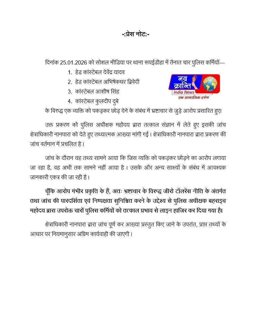 दिनांक 25.01.2026 को सोशल मीडिया के माध्यम से थाना रूपईडीहा में तैनात चार पुलिसकर्मियों के विरुद्ध एक व्यक्ति को पकड़कर छोड़ देने के संबंध में भ्रष्टाचार से जुड़े आरोप प्रसारित हुए। उक्त प्रकरण को पुलिस अधीक्षक बहराइच द्वारा तत्काल संज्ञान में लेते हुए जांच के आदेश प्रदान किए गए।