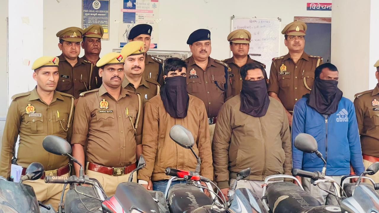 थानाः- कोतवाली नगरपुलिस अधीक्षक जनपद बहराइच द्वारा अपराध व अपराधियों की रोक-थाम एवं वांछित अपराधियों की गिरफ्तारी हेतु दिये गये दिशा-निर्देश के क्रम में अपर पुलिस अधीक्षक नगर अशोक कुमार सिंह व क्षेत्राधिकारी नगर नारायण दत्त मिश्रा के कुशल नेतृत्व में थाना कोतवाली नगर पुलिस टीम को मिली सफलता, मु0अ0सं0 265/2025 धारा- 318(4), 338, 336(3), 340(2), 303(2), 317(2), 317(4), 317(5) बी0एन0एस0 के 03 अभियुक्त गिरफ्तार, चोरी का माल बरामद ।o घटना के अनावरण का विवरण-दिनांक 28.11.2025 को प्रभारी निरीक्षक कोतवाली नगर के नेतृत्व में गठित पुलिस टीम द्वारा हनुमान मंदिर निकट झिंगहा घाट पर संदिग्ध व्यक्ति/ वस्तु/ वाहन की चेकिंग की जा रही थी कि मुखबिर खास ने सूचना दी कि 02 व्यक्ति 02 मोटरसाइकिल से तिकोनी बाग की तरफ से झिंगहा घाट की तरफ आ रहे हैं कि पुलिस टीम द्वारा की जा रही सघन चेकिंग के दौरान दोनों व्यक्तियों से नाम-पता पूछते हुए वाहन के कागजात मांगे गये तो दोनों नेअपना नाम 1.सरवन कुमार मौर्या पुत्र साधू शरण मौर्या निवासी चन्दनापुर सिकड़िया, कोतवाली देहात, बहराइच, 2.जीवन लाल यादव पुत्र सहजराम यादव निवासी माधोपुर बैकुण्ठा, थाना हरदी, बहराइच बताया व दोनों मोटरसाइकिल से सम्बन्धित कोई भी कागजात नहीं दिखा सके, जिसपर कड़ाई से पूछताछ करने पर दोनों द्वारा बताया गया कि यह दोनों मोटरसाइकिल चोरी की हैंजिन्हें भिन्न-भिन्न स्थानों से चुराया है और चोरी की गयी मोटरसाइकिलों को अपने 01 अन्य साथी ननकऊ पुत्र होली जायसवाल निवासी कल्याणपुरवा बैकुण्ठा, थाना हरदी, बहराइच की कबाड़ की दुकान पर छिपाने जा रहे थे । जिसपर पुलिस द्वारा दोनों से और अधिक गम्भीरता व कड़ाई से पूछताछ की गयी तो दोनों चोरों द्वारा भिन्न-भिन्न स्थानों से चोरी की गयी मोटरसाइकिलों को चोरी करने की बात स्वीकार की गयी जिन्हें ननकऊ की भगवानपुर चौराहे स्थित कबाड़ की दुकान में छिपाकर रखने की बात बतायी गयी ।इस प्रकार पुलिस टीम द्वारा दोनों अभियुक्तों के बताए स्थान पर पहुँचकर अभियुक्तों की निशानदेही पर मौके पर कबाड़ की दुकान में छिपाकर रखी गयी 05 अन्य चोरी की मोटरसाइकिलों को सकुशल बरामद किया गया तथा दुकान की सघन तलाशी लेने पर 08 अन्य मोटरसाइकिल की चेचिस मय चेसिस नम्बर व उनके भिन्न-भिन्न कलपुर्जे बरामद किये गये ।मौके से तीसरे अभियुक्त ननकऊ पुत्र होली जायसवाल निवासी कल्याणपुरवा बैकुण्ठा, थाना हरदी, बहराइच को गिरफ्तार किया गया व बरामदगी के आधार पर फर्द बरामदगी व गिरफ्तारी के सम्बन्ध में थाना स्थानीय पर मु0अ0सं0 265/2025 धारा- 318(4), 338, 336(3), 340(2), 303(2), 317(2), 317(4), 317(5) बी0एन0एस0 पंजीकृत कर माननीय न्यायालय व मानवाधिकार आयोग के आदेशों निर्देशों का पालन करते हुए तीनों अभियुक्तों को गिरफ्तार कर, बरामद मोटरसाइकिलों को नियमानुसार कब्ज