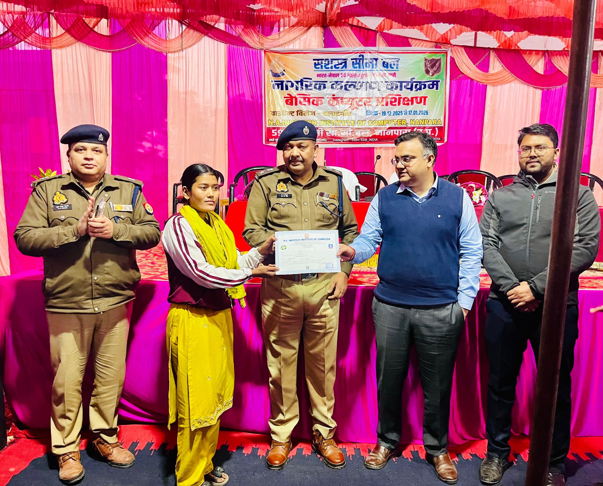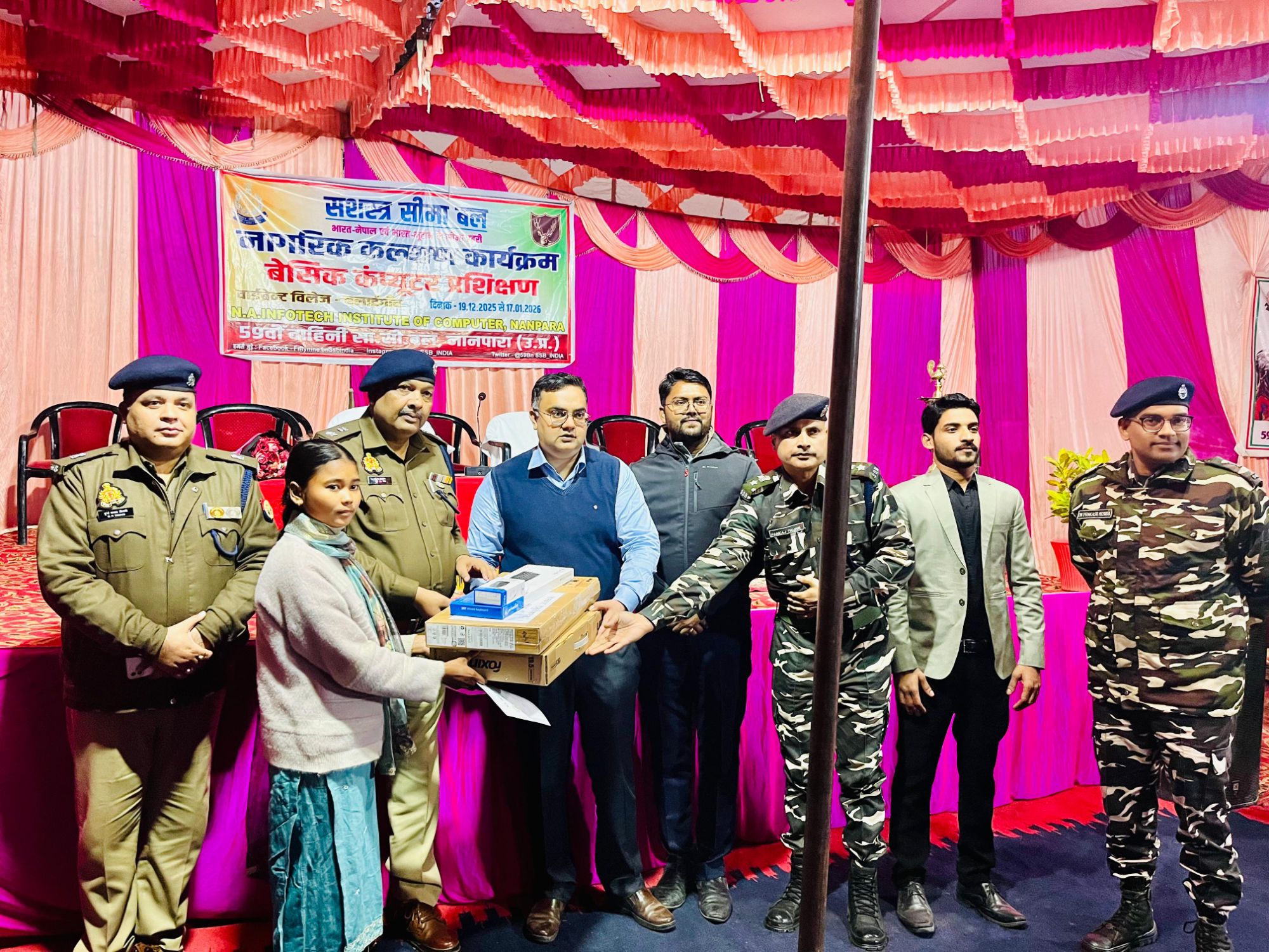बहराइच।जिलाधिकारी , पुलिस अधीक्षक , मुख्य विकास अधिकारी , अपर पुलिस अधीक्षक ग्रामीण व 59वीं वाहिनी, सशस्त्र सीमा बल के कमांडेंट की उपस्थिति में 59वीं वाहिनी एसएसबी द्वारा जनपद बहराइच के बलई गाँव स्थित बीओपी परिसर में नागरिक कल्याण कार्यक्रम के अंतर्गत बेसिक कंप्यूटर प्रशिक्षण कार्यक्रम का आयोजन किया गया।