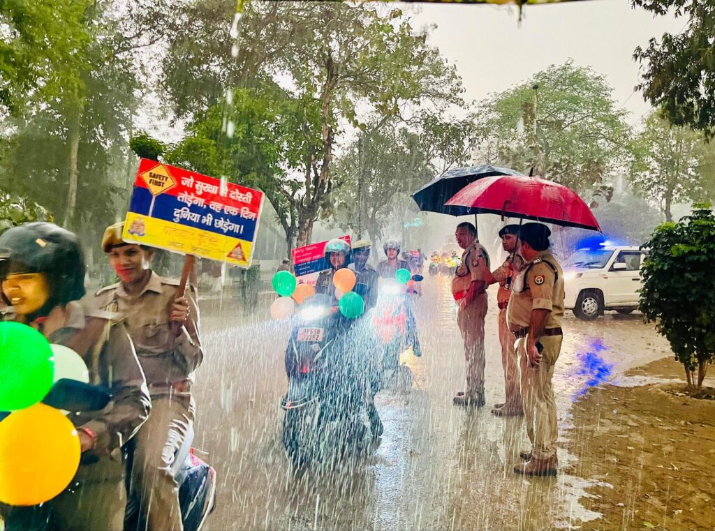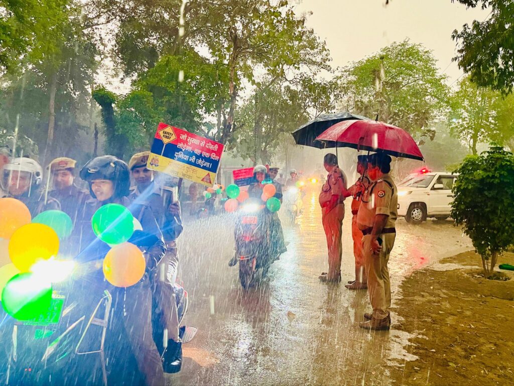 बारिश के बावजूद कार्यक्रम में मौजूद पुलिसकर्मियों का उत्साह देखते ही बन रहा था। छातों के सहारे खड़े अधिकारी और भीगते हुए भी ड्यूटी निभाते जवानों ने यह संदेश दिया कि नारी सुरक्षा और सम्मान के लिए उनका संकल्प अटूट है।