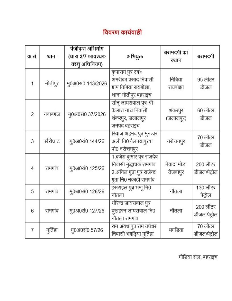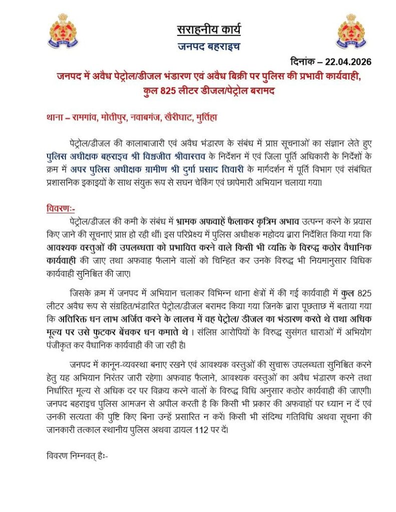 बहराइच, 22 अप्रैल। जनपद में पेट्रोल-डीजल की कालाबाजारी और अवैध भंडारण के खिलाफ पुलिस ने व्यापक अभियान चलाते हुए बड़ी कार्रवाई की है। विभिन्न थाना क्षेत्रों में की गई छापेमारी के दौरान कुल 825 लीटर पेट्रोल/डीजल बरामद किया गया।