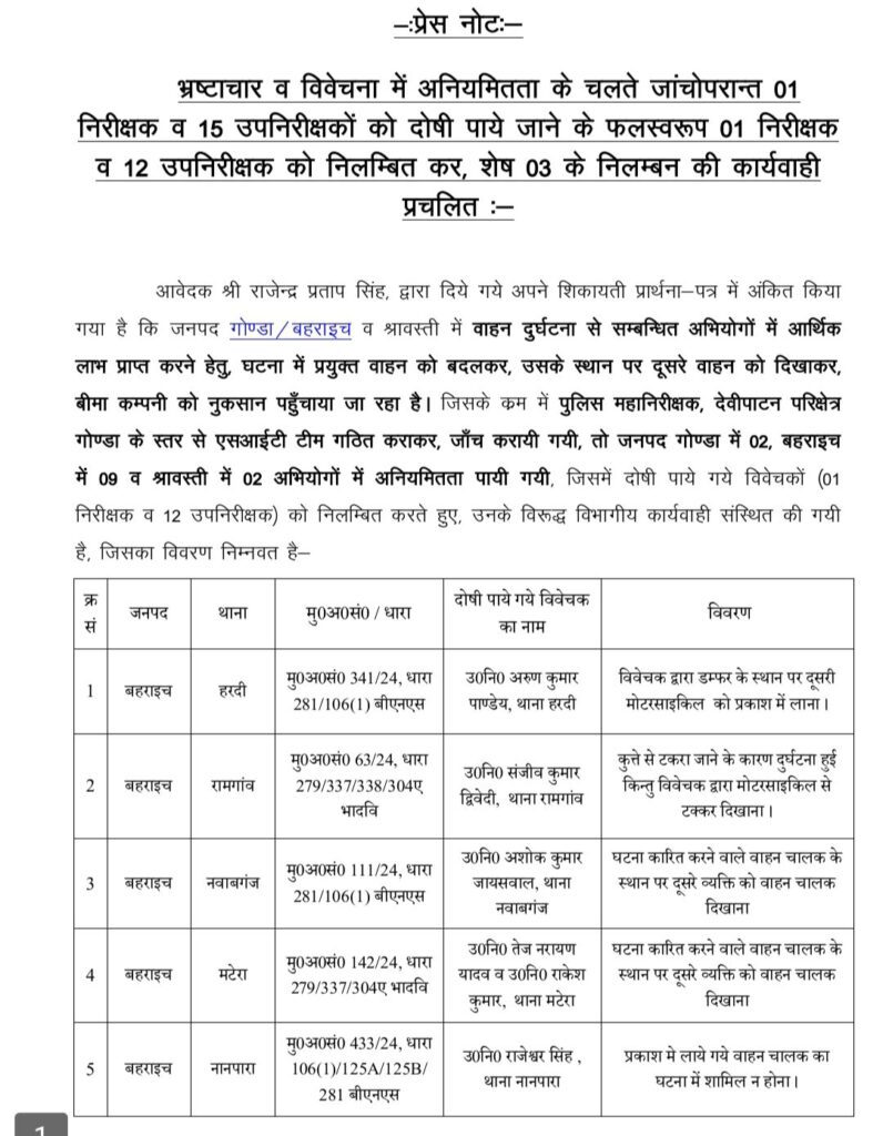 वाहन दुर्घटना से जुड़े मुकदमों में जानबूझकर की गई गलत विवेचना, भ्रष्ट आचरण और न्यायालय को गुमराह करने के गंभीर मामलों में देवीपाटन परिक्षेत्र पुलिस में बड़ी कार्रवाई सामने आई है। आईसीआईसीआई लोम्बार्ड बीमा कंपनी के अधिकारी राजेन्द्र प्रताप सिंह की शिकायत पर पुलिस महानिरीक्षक देवीपाटन परिक्षेत्र द्वारा सख्त रुख अपनाते हुए दोषी विवेचकों के खिलाफ कड़ा एक्शन लिया गया है।