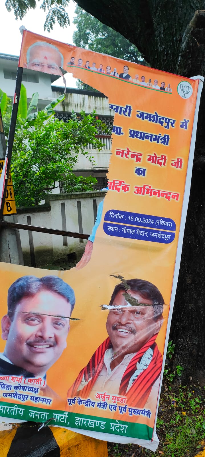 जमशेदपुर में प्रधानमंत्री मोदी के परिवर्तन महारैली के ठीक अगले ही दिन एक समुदाय विशेष के पर्व पर निकाली रैली में शामिल असामाजिक तत्वों द्वारा प्रधानमंत्री नरेंद्र मोदी के स्वागत में लगे सैकड़ो बैनर पोस्ट को चिन्हित करके उनके चेहरे को फाड़ कर हटा फेंकने का कथित आरोप लगा है।