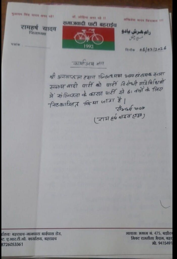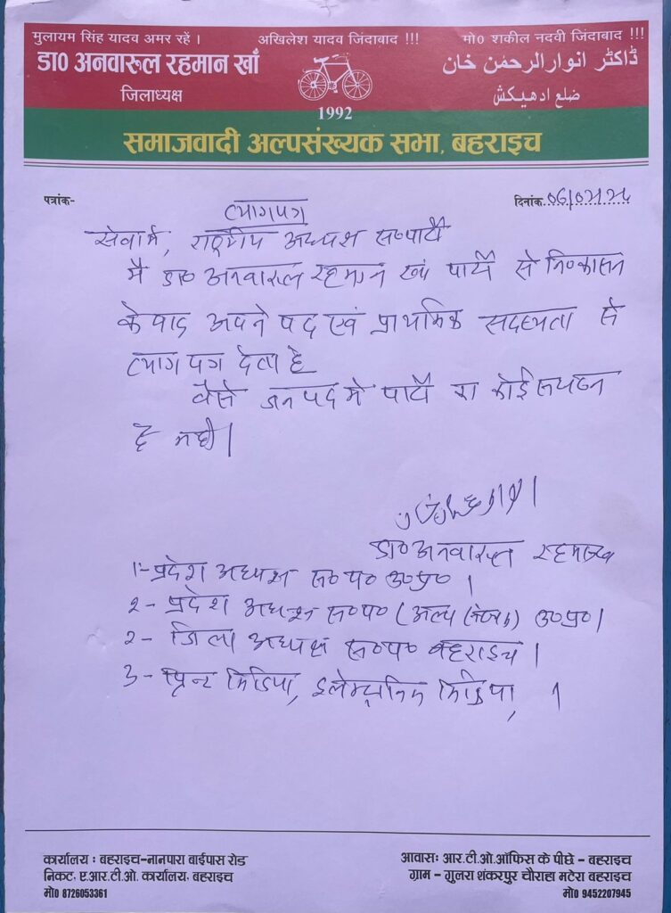 मैं, डॉ. अनवारुल रहमान ख़ान, समाजवादी पार्टी अल्पसंख्यक सभा बहराइच का जिला अध्यक्ष था। पार्टी द्वारा निष्कासन के बाद मैं अपने सभी पदों और प्राथमिक सदस्यता से इस्तीफ़ा देता हूँ।