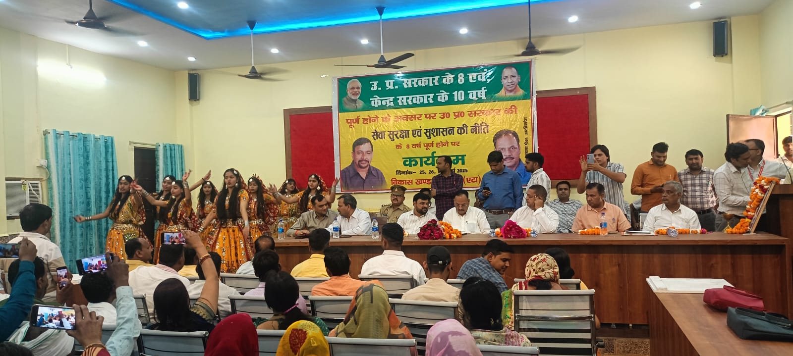 अलीगंज। उत्तर प्रदेश में योगी सरकार के सफलतापूर्वक आठ वर्ष और केंद्र सरकार के 10 वर्ष पूरे होने पर विकास खण्ड सभागार में सेवा, सुरक्षा और सुशासन मेला का आयोजन किया गया। विधायक सत्यपाल सिंह राठौर, उपजिलाधिकारी विपिन कुमार मोरल और ब्लॉक प्रमुख प्रतिनिधि डॉ अशोक रतन शाक्य ने मां सरस्वती के चित्र पर माल्यार्पण कर दीप प्रज्वलित करकार्यक्रम का शुभारंभ किया। छात्राओं ने सांस्कृतिक कार्यक्रमों की प्रस्तुतियां दीं।