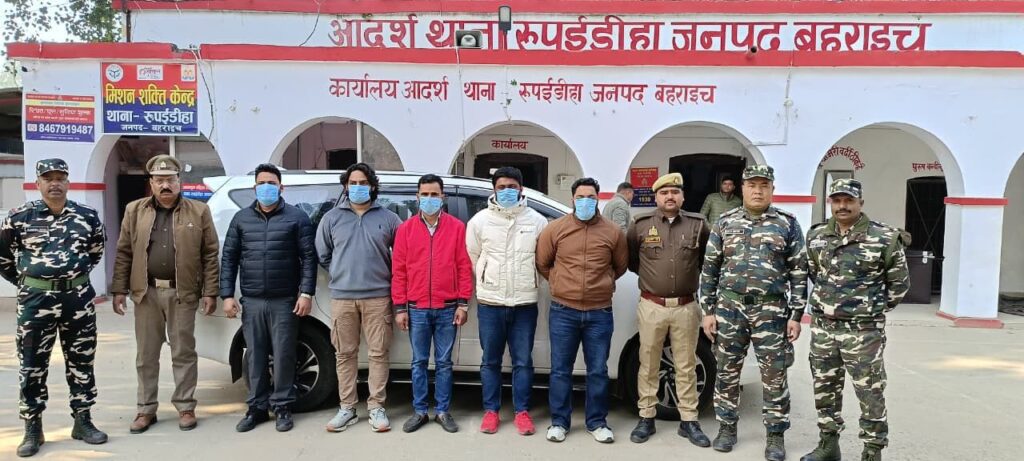 बहराइच । पुलिस अधीक्षक के कुशल निर्देशन में अपराध एवं अपराधियों पर अंकुश लगाने हेतु की जा रही कार्यवाही के क्रम में अपर पुलिस अधीक्षक (ग्रामीण) दुर्गा प्रसाद तिवारी एवं क्षेत्राधिकारी नानपारा पहुप सिंह के पर्यवेक्षण में प्रभारी निरीक्षक रुपईडीहा रमेश रावत मय पुलिस बल व एसएसबी की संयुक्त टीम द्वारा भारत के रास्ते नेपाल में प्रवेश कर रहे 05 व्यक्तियों को किया गया गिरफ्तार ।