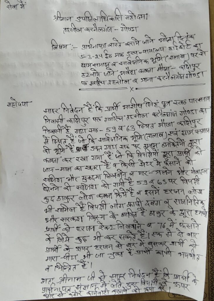 ग्राम कादीपुर निवासी आशीष सिंह पुत्र स्वर्गीय पारसनाथ सिंह ने उप जिलाधिकारी कर्नलगंज को दिए गए प्रार्थना पत्र में बताया है कि ग्राम कादीपुर स्थित गाटा संख्या 59 व 63, जो कि सार्वजनिक तालाब व ग्राम समाज की भूमि है, उस पर कई लोगों ने पक्का मकान बनाकर अवैध कब्जा कर लिया है। प्रार्थी के अनुसार इस मामले में हाईकोर्ट का निर्देश भी हो चुका है तथा पूर्व में तहसील दिवस में प्रार्थना पत्र देकर जिलाधिकारी गोण्डा व उप जिलाधिकारी कर्नलगंज को भी अवगत कराया जा चुका है।