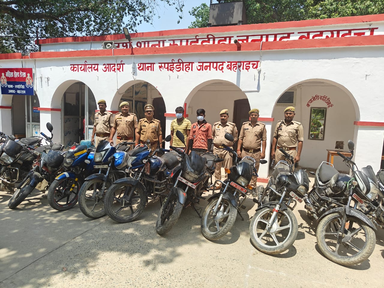 पुलिस अधीक्षक बहराइच के कुशल निर्देशन में अपराध एवं अपराधियों पर अंकुश लगाने हेतु की जा रही कार्यवाही के क्रम में अपर पुलिस अधीक्षक (ग्रामीण) दुर्गा प्रसाद तिवारी एवं क्षेत्राधिकारी नानपारा प्रद्युम्न सिंह के पर्यवेक्षण में प्रभारी निरीक्षक रुपईडीहा श्री दद्दन सिंह मय पुलिस बल द्वारा 15 अदद चोरी की मोटरसाइकिल के साथ 02 अन्तर्राष्ट्रीय मोटरसाइकिल चोरों को किया गया गिरफ्तार ।