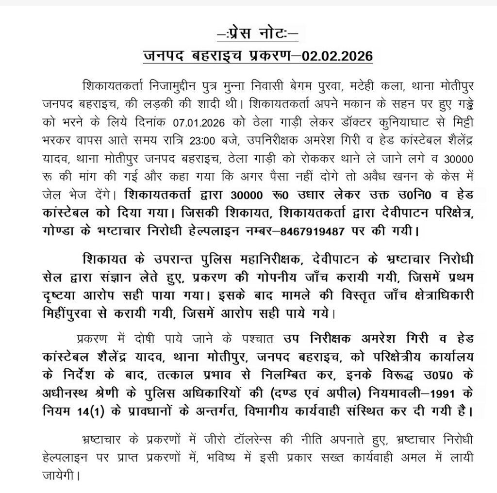 जनपद बहराइच के थाना मोतीपुर में तैनात उपनिरीक्षक और हेड कांस्टेबल द्वारा खुलेआम रिश्वतखोरी का सनसनीखेज मामला सामने आया है। अवैध खनन के नाम पर कार्रवाई से बचाने के एवज में ₹30,000 की रिश्वत लेने के आरोप में दोनों पुलिसकर्मियों को तत्काल प्रभाव से निलंबित कर दिया गया है।