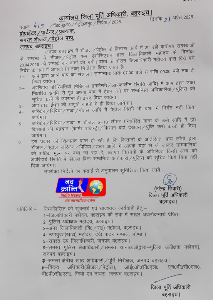 जनपद बहराइच में पेट्रोल-डीजल की बिक्री को लेकर प्रशासन ने सख्त रुख अपनाया है। जिला पूर्ति अधिकारी द्वारा जारी नए आदेशों में सभी पेट्रोल पंप संचालकों को स्पष्ट निर्देश दिए गए हैं कि अब तेल केवल निर्धारित नियमों के तहत ही बेचा जाएगा।