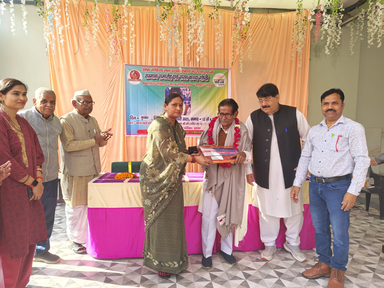उ.प्र. साहित्य सभा इटावा इकाई के तत्वावधान में इटावा के वरिष्ठ साहित्यकार शायर जनाब साबिर हुसैन ‘साबिर’ का अभिनन्दन समारोह चहल-पहल कोर्टयार्ड में संपन्न हुआ। साहित्य सभा कार्यकारिणी सदस्य अमित कुमार के कुशल संयोजन में अभिनंदन समारोह के साथ सरस काव्य गोष्ठी भी संपन्न हुयी जिसका निर्देशन ख़्यातिलब्ध गीतकार डॉ राजीव राज ने किया। कार्यक्रम की अध्यक्षता भारत विकास परिषद इटावा के संरक्षक आशाराम मिश्रा ने की जबकि मुख्य अतिथि के रूप में पूर्व मंत्री, वरिष्ठ ग़ज़लकार अशोक यादव उपस्थित रहे।