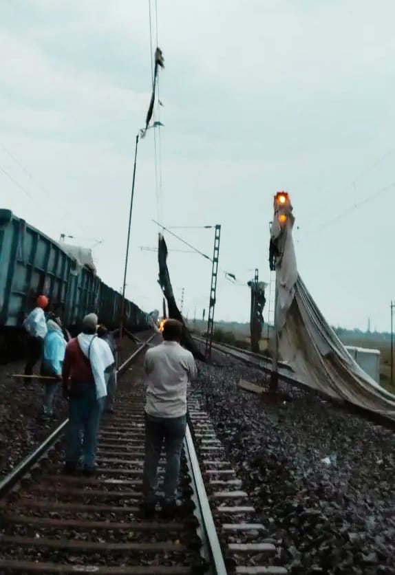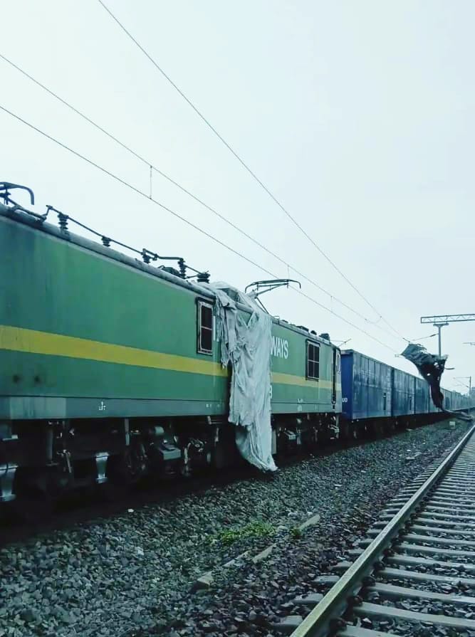 साउथ ईस्टर्न रेलवे अंतर्गत सीनी मे; मालगाड़ी में लगे तिरपाल के चिथड़े उड़े। आंधी-तूफान से कई ट्रेन हुए प्रभावित।